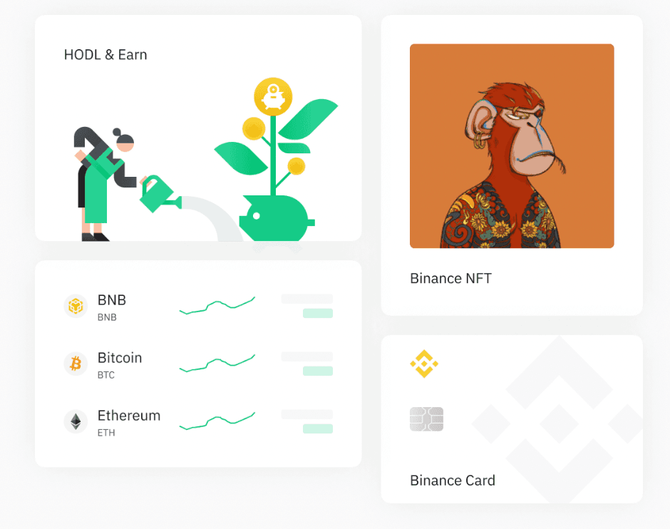 Hos Binance kan du kjøpe, selge og holde 600+ kryptovalutaer, du kan handle NFT'er, og du kan bruke kryptovalutaene dine som betalingsmiddel gjennom et Binance VISA-kort.