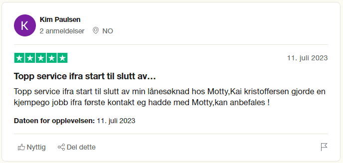 Ovenfor ser du den nyeste 5-stjerners anmeldelsen som ble lagt til i juli 2023. Her nevner personen er medarbeider som tydeligvis har gitt god service under hele låneprosessen. Dette viser at de tar direkte kontakt med kunder for å hjelpe dem med søknaden.