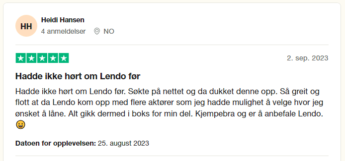 Som nevnt tidligere har Lendo.no fått mange positive tilbakemeldinger på trustpilot fra sine kunder.