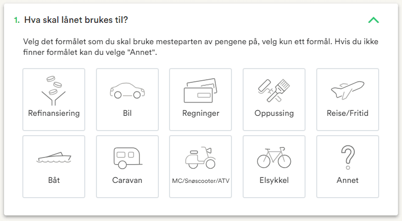 Lånebeløp:Opptil 600.000 kr på forbrukslån og refinansiering | Opptil 800.000 på billån | Opptil 30 millioner på boliglån