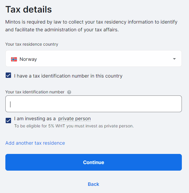I og med at dette er en investeringsplattform er dette trinnet ganske omfattende. Du må blant annet oppgi adresse, bostedsland og laste opp et ID-dokument som pass.