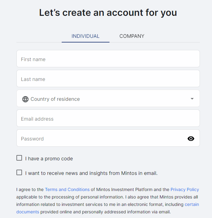 Gå til forsiden på Mintos og klikk på "Create account". Deretter får du opp et skjema som ser slik ut: