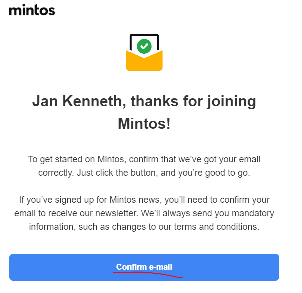 Etter at du er ferdig med registreringsskjema er du nødt til å gå til innboksen din og finne e-posten som du har mottatt fra Mintos.