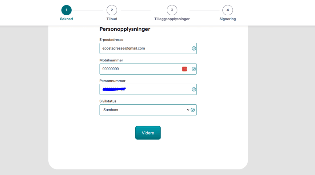 Her skal du først fylle inn e-postadresse, telefonnummer, personnummer og din sivilstatus. Deretter får du også spørsmål om din arbeidssituasjon, brutto inntekt og husleie.