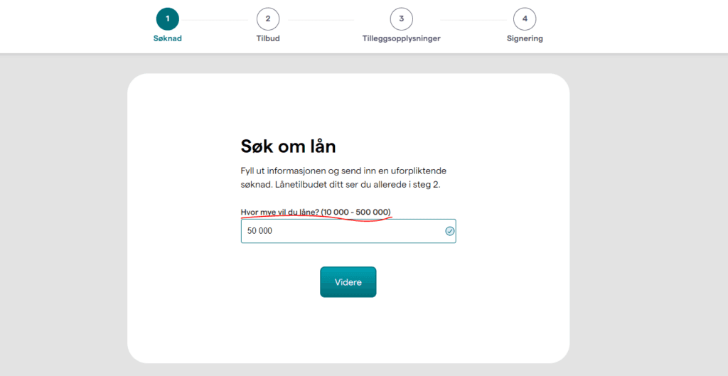 I starten av lånesøknaden skriver du manuelt inn selv hvilket beløp du ønsker fra 10,000 og opptil 500,000 kroner. Deretter klikker du på "videre".