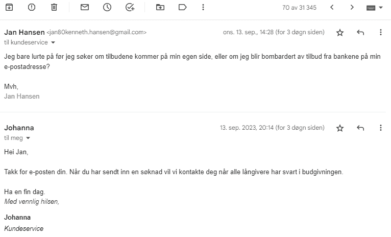 For en positiv opplevelse. Desisert det billigste lånet jeg noengang har fått, og fikk fantastisk oppfølging. Fikk svar på e-post under 5 min etter at jeg sendte den.