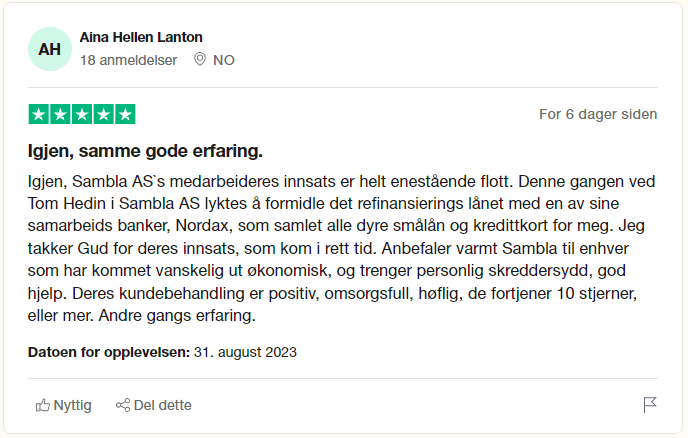 I anmeldelsen nevnes spesifikt en flink medarbeider som har hjulpet kunden med å refinansiere gjelden sin. Dette viser at Sambla er ikke bare en selvbetjent nettside, men de bistår også kunden med gode rådgivere.