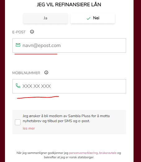 Etter at du har valgt om du skal refinansiere eller ikke, kommer det opp et kontaktskjema hvor du er nødt til å fylle ut telefonnummer og e-post for å gå videre.