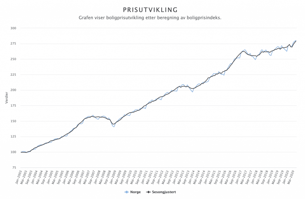 Som grafen illustrerer kan vi se en relativt stabil og jevn utvikling av boligprisene. Verdien er nærmest 3-doblet over de siste 17 årene.