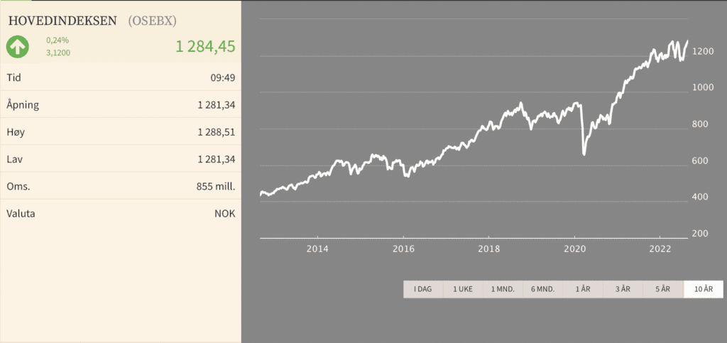 Hvis vi ser på Oslo børs Hovedindeks (OSEBX) ligger den i skrivende stund på 1284,02 (Aug. 2022). Hvis vi går lenger tilbake i tid og ser på utviklingen kan vi se følgende.