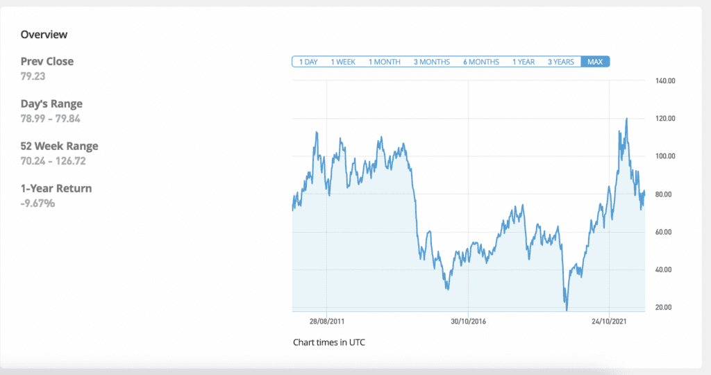 Hvis vi ser nærmere på grafen nedenfor kan vi se en utvikling helt tilbake fra 2011, hvor oljeprisen lå rundt 115 USD, hvor den i dag ligger på ca. 79 USD.