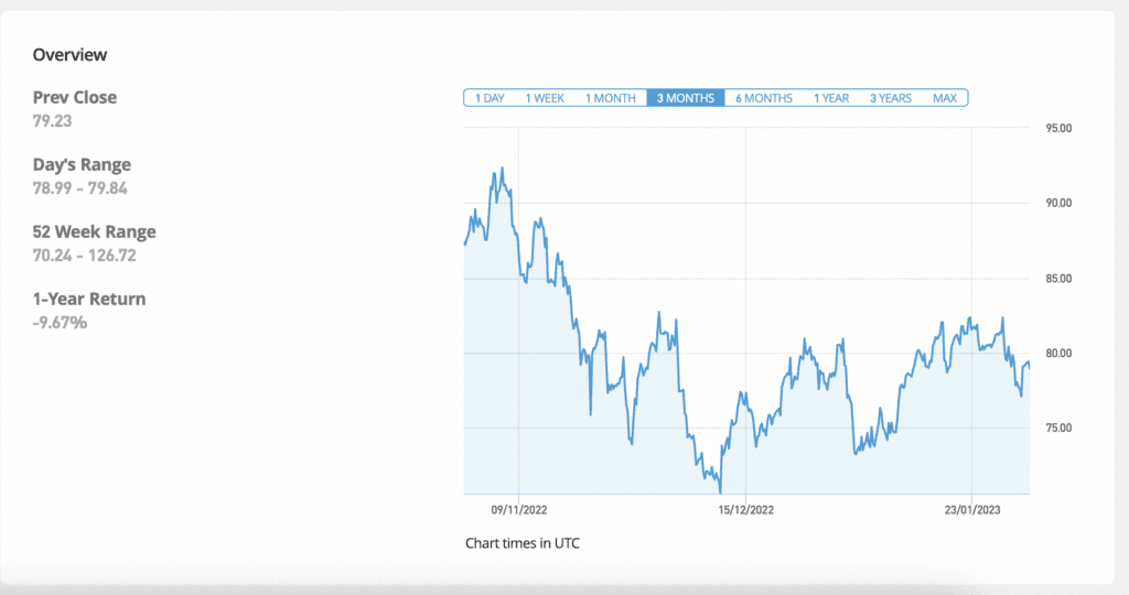 Per 1. februar 2023 er prisen på Brent-råolje, som er en målestokk for det globale oljemarkedet, rundt 79 dollar per fat.