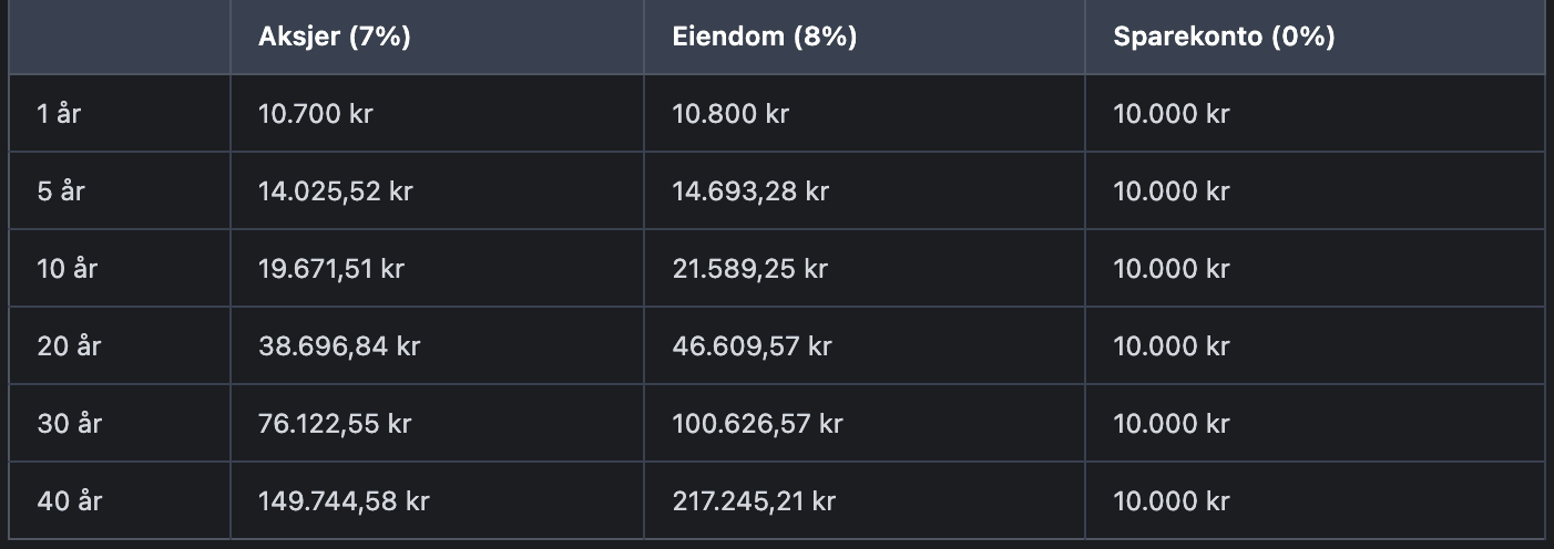 *i eksempelet tar vi utgangspunkt i en årlig rente på 10%. Renten avhenger av hvilken investeringskonto du bruker.