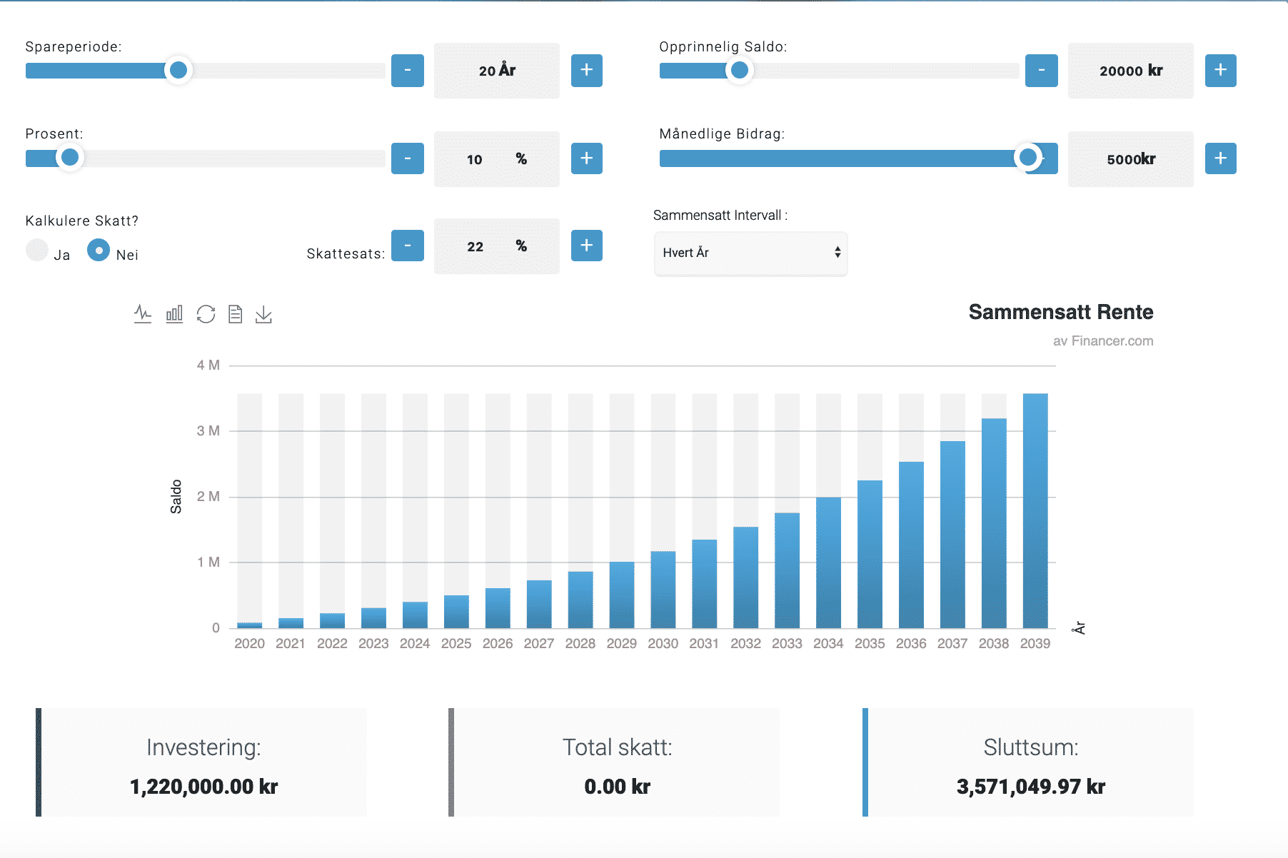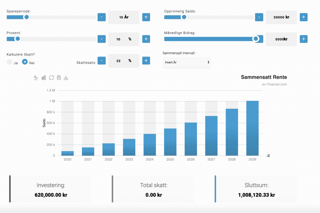 Eksemplet nedenfor illustrerer hvordan du kan dra nytte av rente effekten over tid ved å investere i eksempelvis aksjesparekonto eller fond. Hvis du starter med eksempelvis 20.000 kr. på en aksjesparekonto, og har et månedlig bidrag på 5.000 kr, kan vi se etter 10 år at din egentlige investering ligger på 620.000 kr, men fordi du drar nytte av rente effekten som blir større og større for hvert år, ender du totalt på over 1.008.000 kr. Dette er ikke nødvendigvis så imponerende, selv om det er en god sum penger.