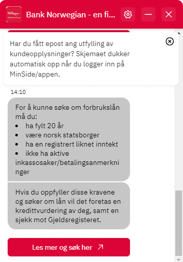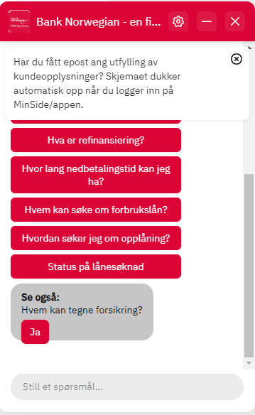 Chat roboten fungerer godt så lenge de faktisk har god informasjon på nettsidene, og det har Bank Norwegian sørget for.