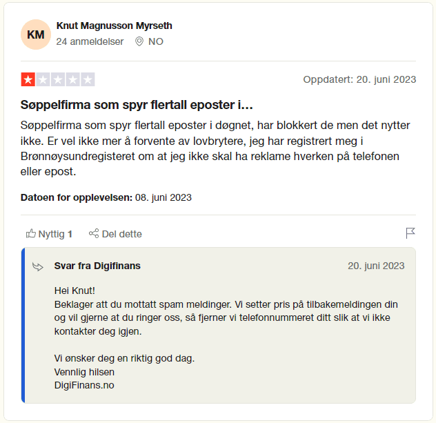 Her skal vi se på noen typiske tilbakemeldinger som DigiFinans har fått på Trustpilot: