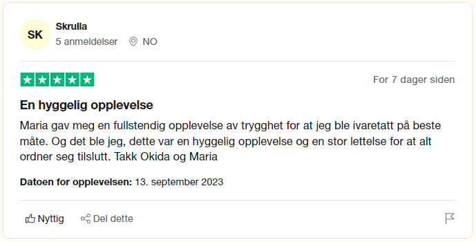 Per dags dato har Okida over 450 anmeldelser på Trustpilot, hvor 99 % av kundene gir 5 stjerner. Dette er et godt tegn på at kundene er svært fornøyde med oppfølgningen de går fra Okida i forbindelse med å refinansiere inkassosaker og betalingsanmerkninger.