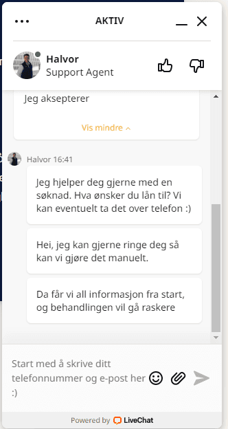 Ikke bare ønsker de å hjelpe med søknaden, men de tilbyd også å ringe deg opp for å hjelpe deg. Fra vi sendte meldingen til vi fikk svar tok det ikke mer enn 1 minutt!