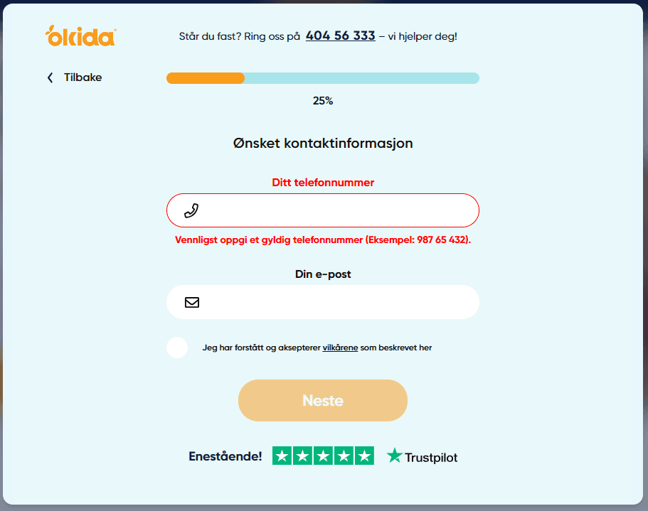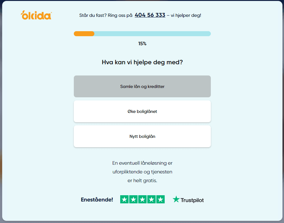 Okida har en svært fornøyd kundebase med 99% 5-stjerners anmeldelser på Trustpilot. Brukervennligheten på nettsiden er god, men søknadsprosessen kunne vært enda mer selvforklarende.