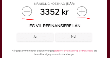 For å velge antall år du skal nedbetale må du bruke + og - tegnene som du ser på kalkulatoren. Da får du stipulert ca. hvor mye lånet vil koste deg per måned.
