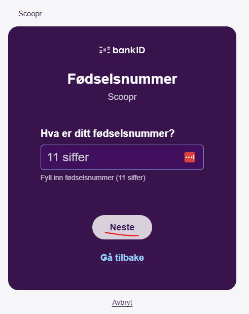 For å kunne søke om lån er du nødt til å ha Bank ID, enten på mobil eller brikke. Først skriver du inn ditt norske fødselsnummer for å logge deg inn, og deretter får Scoopr opplysningene de trenger om din økonomiske situasjon.