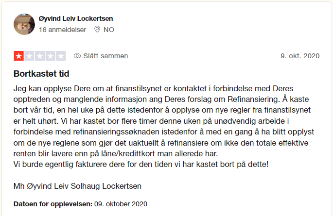 I denne anmeldelsen var det slik at kunden ikke fikk bedre betingelser enn det han hadde i dag. Dermed er det ikke mulig å refinansiere gjelden. Men dette er vel egentlig en positiv ting, i og med at Finanstilsynet setter en stopper for avtaler som "lurer" deg i å tro at du sparer penger.