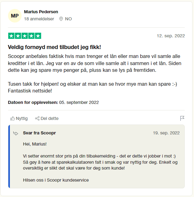 En av de beste funksjonene når du mottar tilbud på Scoopr, er at du kan faktisk se hvor mye du sparer i forhold ti det du betaler på lån i dag. Mange er svært fornøyd med denne løsningen.