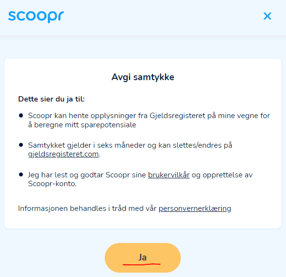 For at Scoopr skal kunne hjelpe deg best mulig, må de innhente opplysninger om deg gjennom Gjeldsregisteret i Norge. Her får de oversikt over gjelden du har i dag hos forskjellige selskaper, og kan skreddersy et lånetilbud til deg.