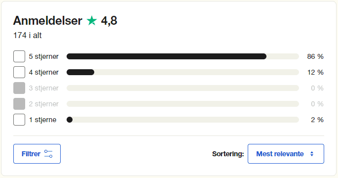 Høy kundetilfredshet (4,8/5 på Trustpilot med 86% 5-stjerners anmeldelser)